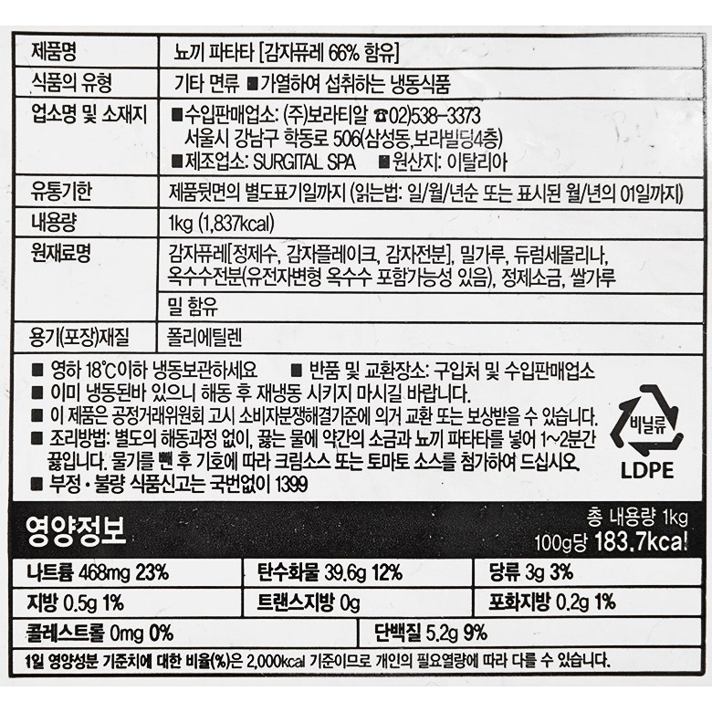 | 제품명 | 뇨끼 파타타 | 식품의 유형 | 기타면류(가열하여 섭취하는 냉동식품) |