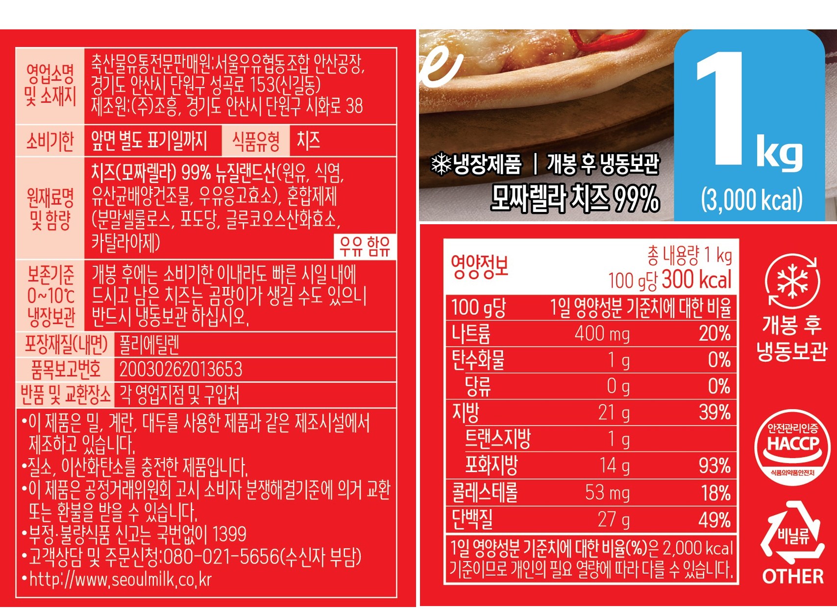 | 제품명 | 서울우유 슈레드 모짜렐라 | 식품의 유형 | 컨텐츠 참조 |