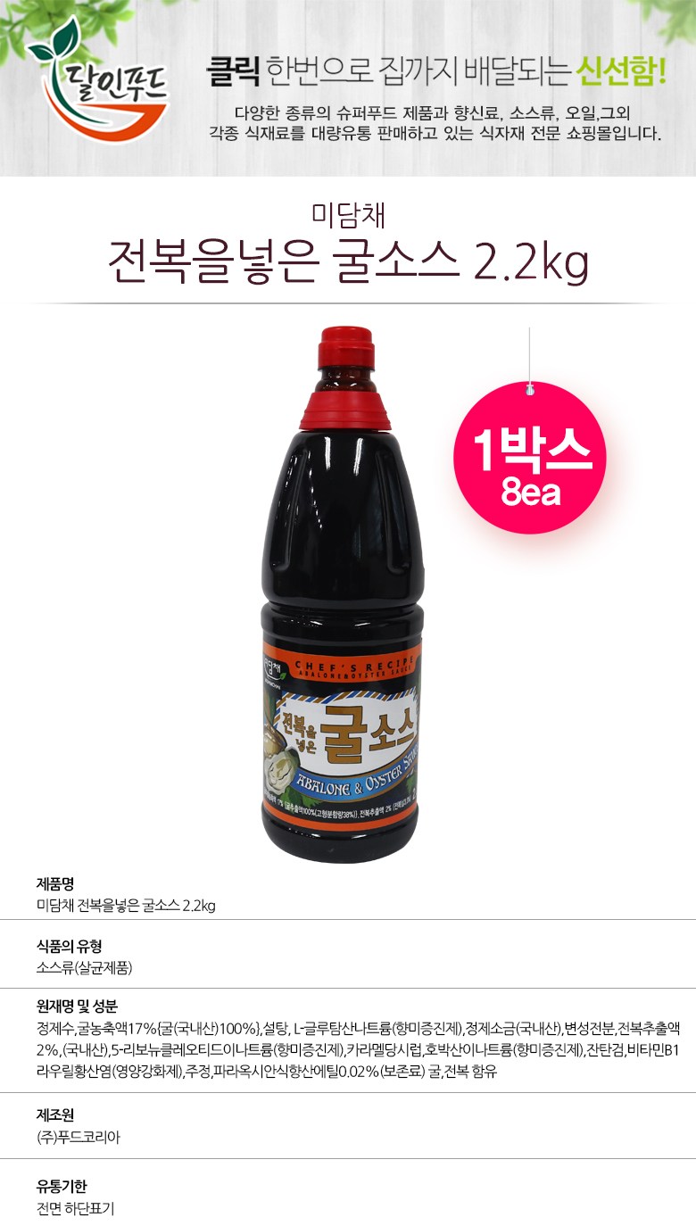 | 제품명 | 미담채 전복을넣은굴소스2.2kg | 식품의 유형 | 굴소스 |