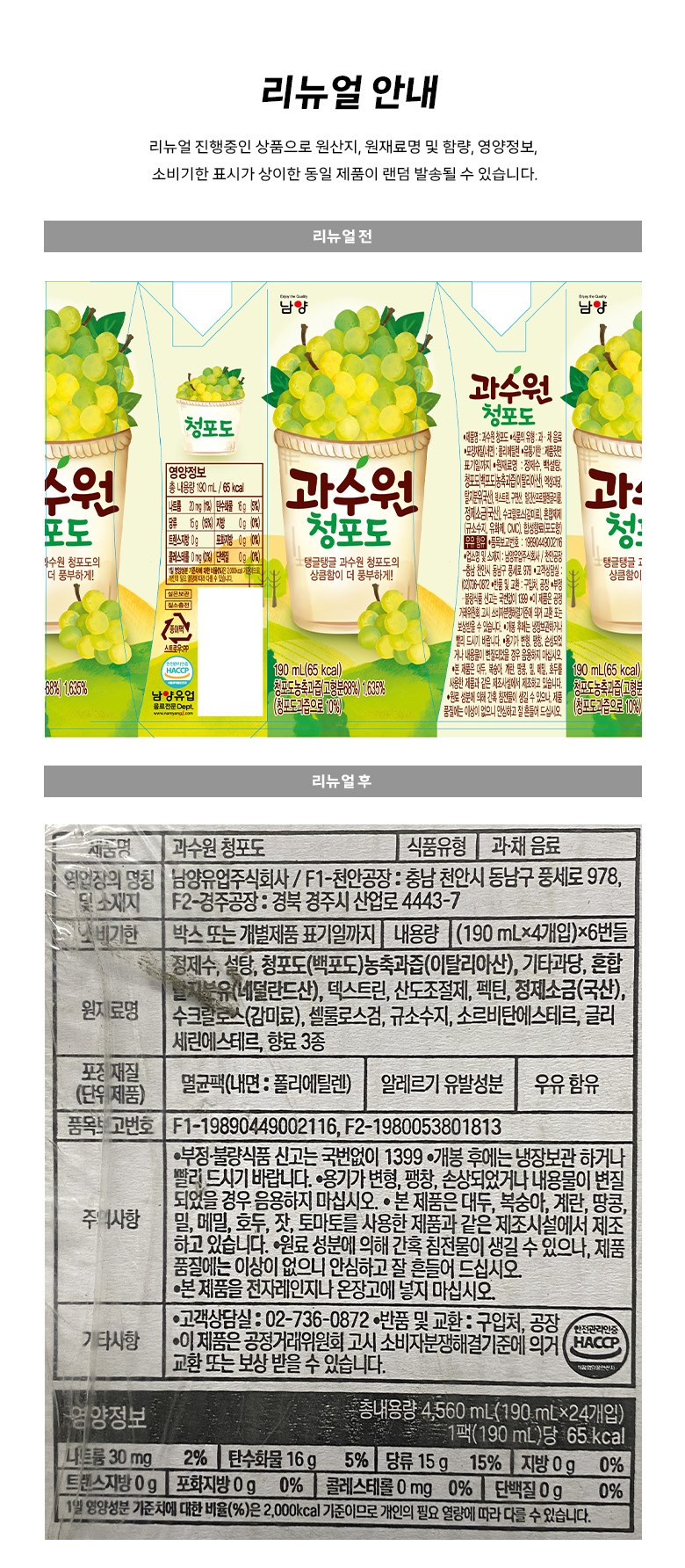 | 제품명 | 과수원 청포도 | 식품의 유형 | 과채음료 |