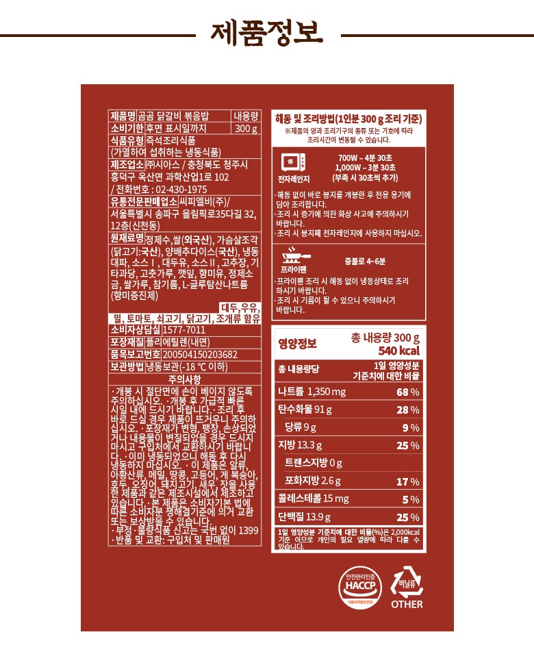 | 제품명 | 곰곰 닭갈비 볶음밥 | 식품의 유형 | 컨텐츠 참조 |