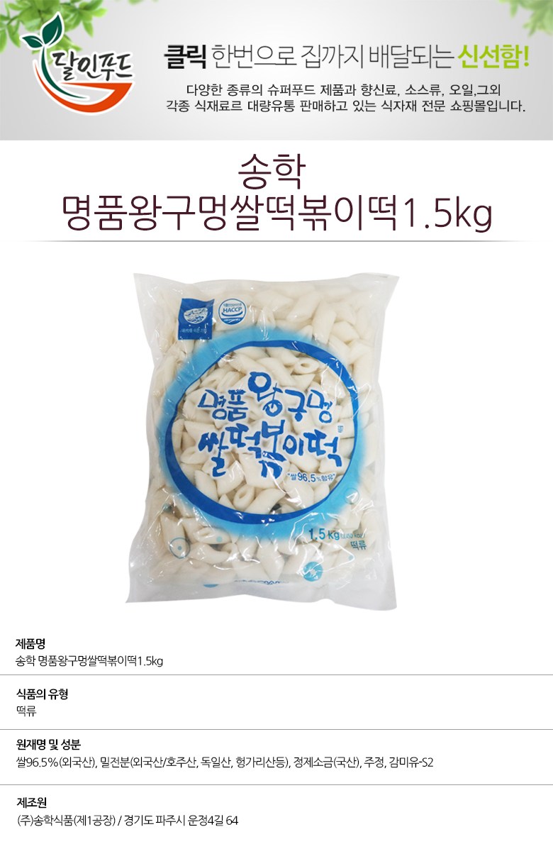 | 제품명 | 송학구멍난쌀떡볶이1.5kg | 식품의 유형 | 떡볶이 |