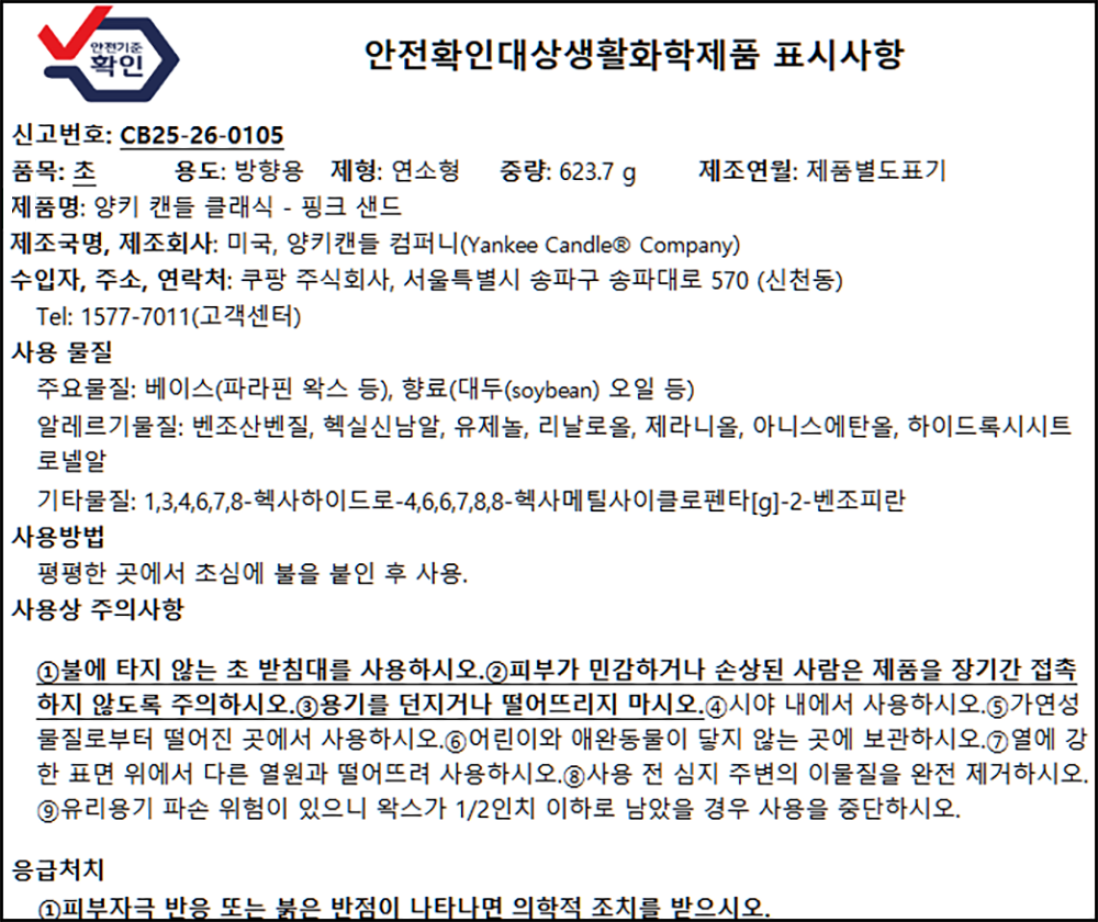 | 품목 및 제품명 | 초 / 양키 캔들 클래식 - 핑크 샌드 | 용도(표백제의 경우 계열을 함께표시) 및 제형 | 방향용 / 연소형 |