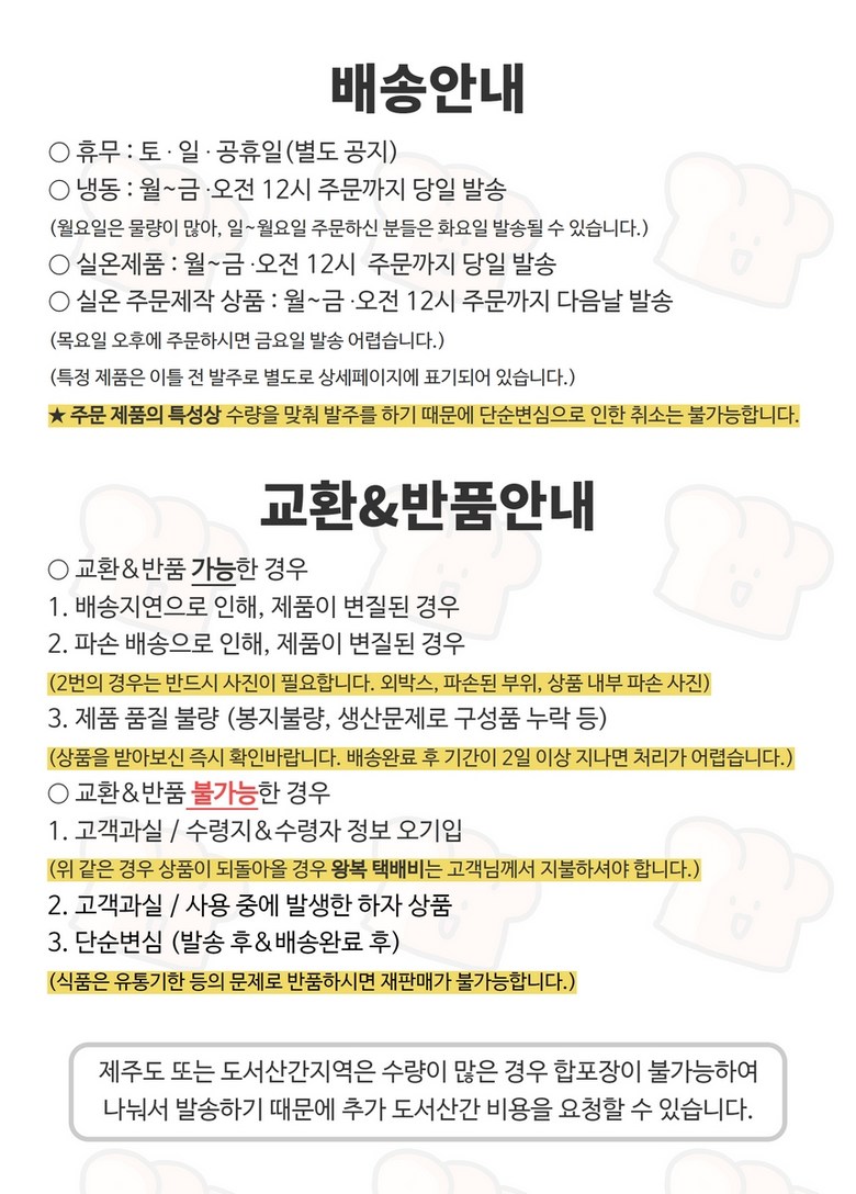 | 배송방법 | 순차배송 | 배송비 | 무료배송 · 도서산간 추가 배송비 - 제주 지역: 3,500원 - 도서산간 지역: 7,000원 |