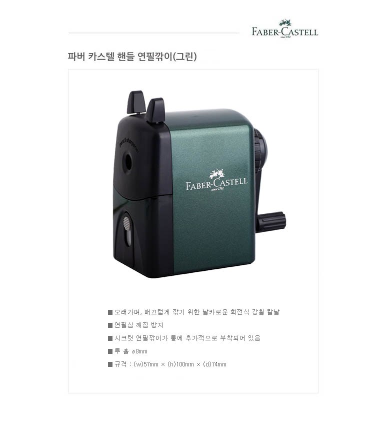 | 품명 및 모델명 | 파버카스텔 전문가용 핸들연필깎이 | 인증/허가 사항 | 해당없음 (14세이상) |