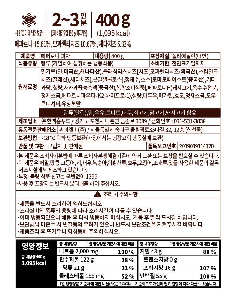 | 제품명 | 곰곰 페퍼로니피자 | 식품의 유형 | 빵류/가열하여 섭취하는 냉동 식품 |