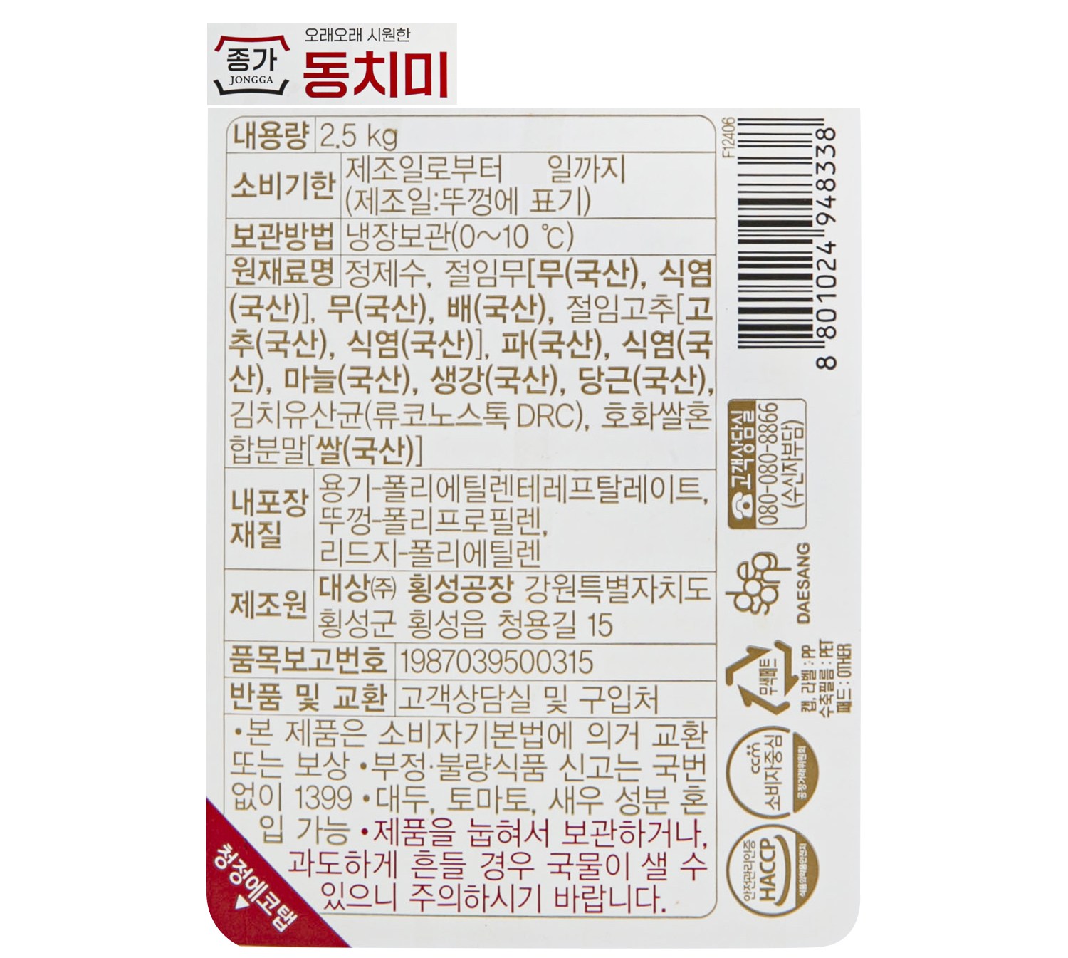 | 제품명 | 동치미 | 식품의 유형 | 김치 |
