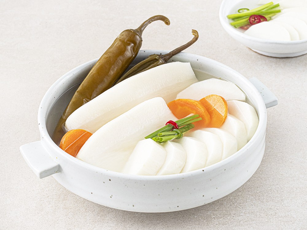 집 나간 입맛도 돌아오게 해 줄 시원한 동치미예요. 달달하고 짭조름하면서도 개운한 국물 맛이 일품인데요. 무를 큼직하게 썰어 넣어 한 입 두 입 베어 무는 재미를 만끽할 수 있지요. 여기에 배, 당근뿐 아니라 절임고추를 더해 살짝 매콤한 끝맛을 완성했답니다. 간단하지만 맛있는 밑반찬으로 제격이에요.