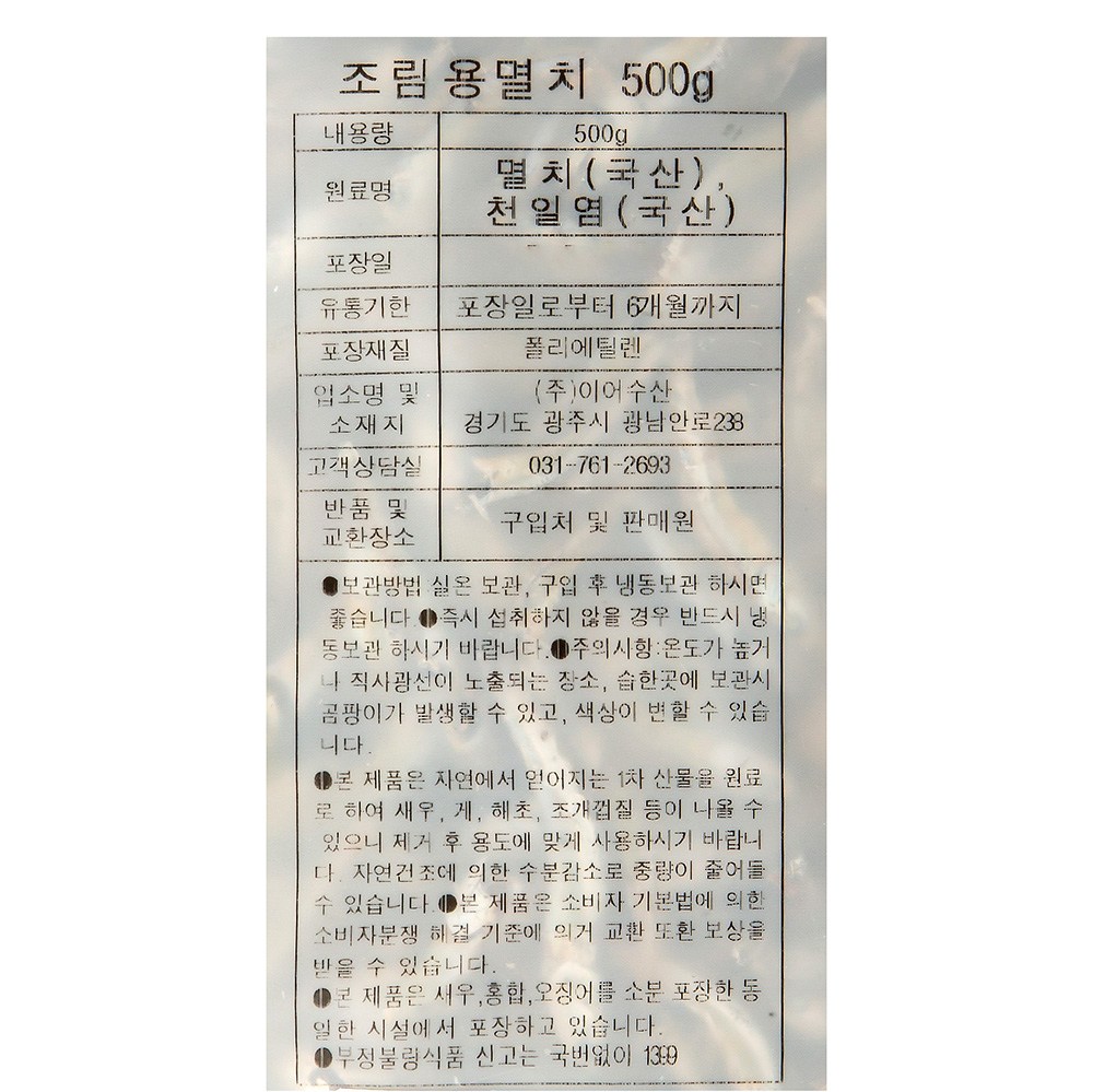 | 품목 또는 명칭 | 조림용 멸치 | 포장단위별 내용물의 용량(중량),수량,크기 | 500g x 3봉,1개 |