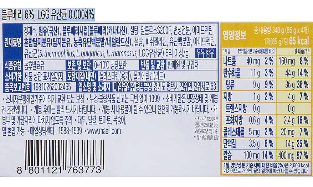 | 제품명 | 바이오 PROBIOTIC 블루베리 요거트 | 식품의 유형 | 농후발효유 |