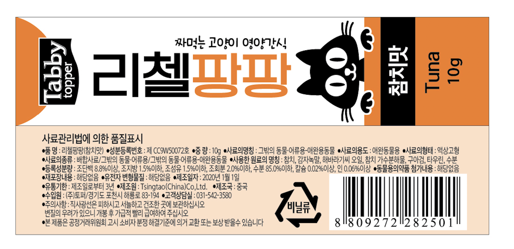 | 품명 및 모델명 | 리첼팡팡(참치맛) | 인증/허가 사항 | 사료관리법에 따른 성분등록번호 : 컨텐츠 참조 |