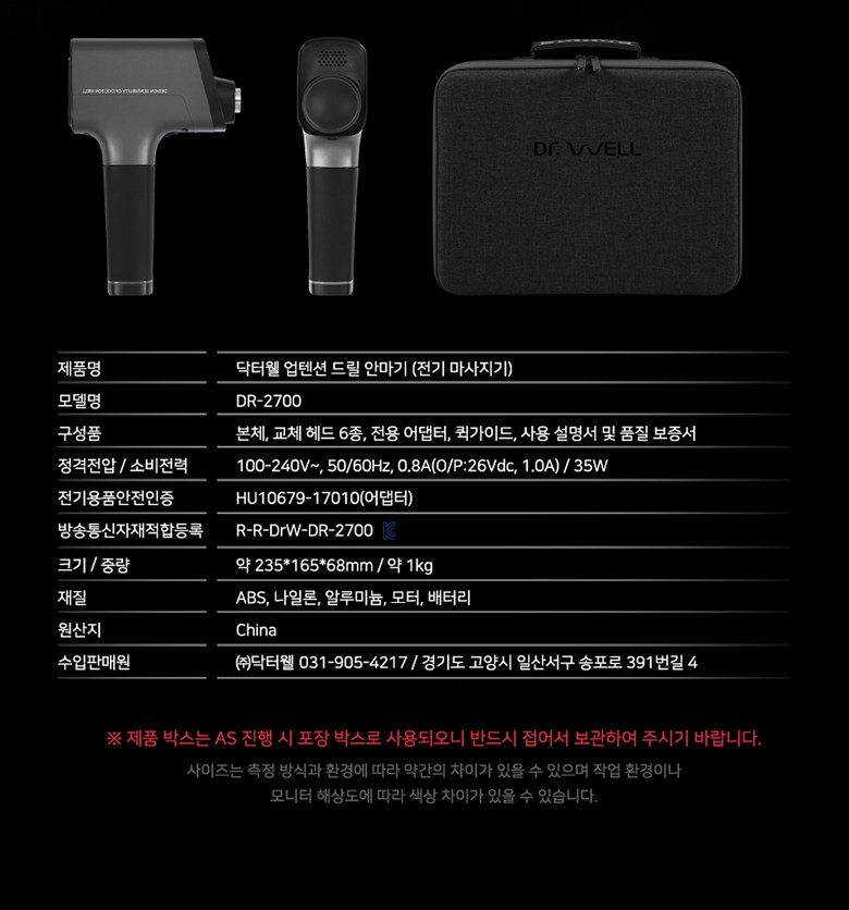 | 품명 및 모델명 | 닥터웰 업텐션 드릴안마기 / DR-2700 | KC 인증정보 | 본품 : R-R-DrW-DR-2700, XU101960-19001A / 어댑터 : HU10679-17010B, MSIP-REM-FY1-FY0421802000K |