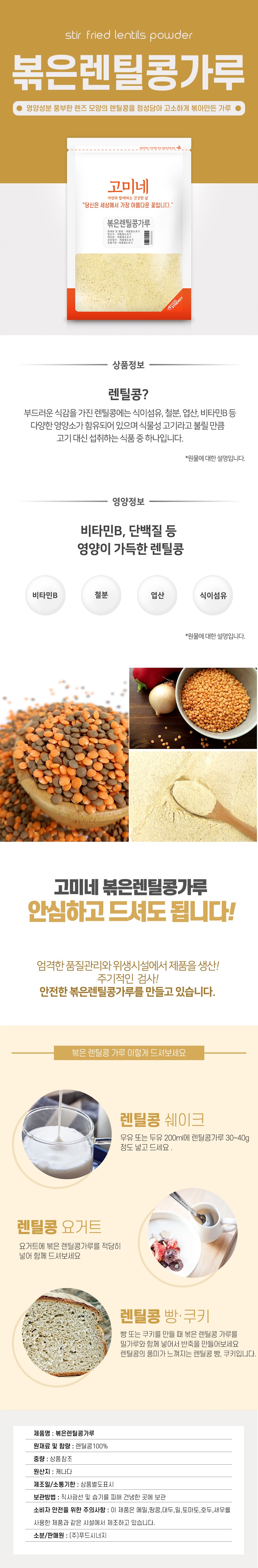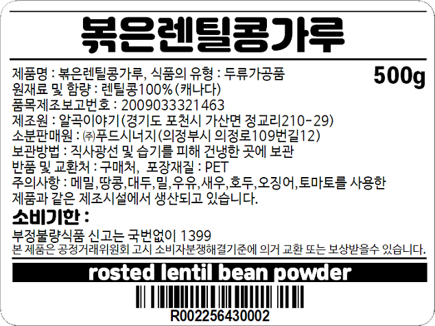 | 제품명 | 볶은 렌틸콩가루 | 식품의 유형 | 컨텐츠 참조 |