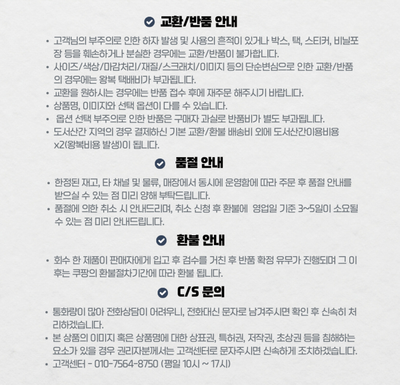 - ㆍ모니터 해상도의 차이로 인해 색상이나 이미지가 실제와 달라, 고객이 단순 변심으로 교환/반품을 무료로 요청하는 경우