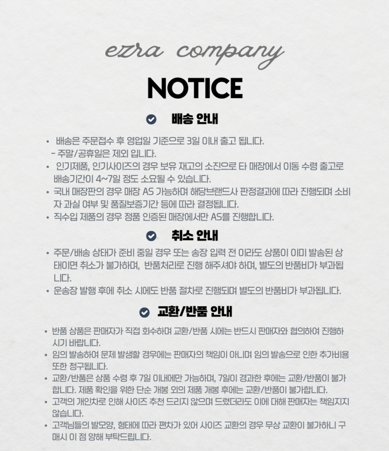 | 교환/반품 비용 (왕복비용) | 7,000원 - 단, 고객 변심의 경우에만 발생 - 도서산간 지역 배송불가 |
