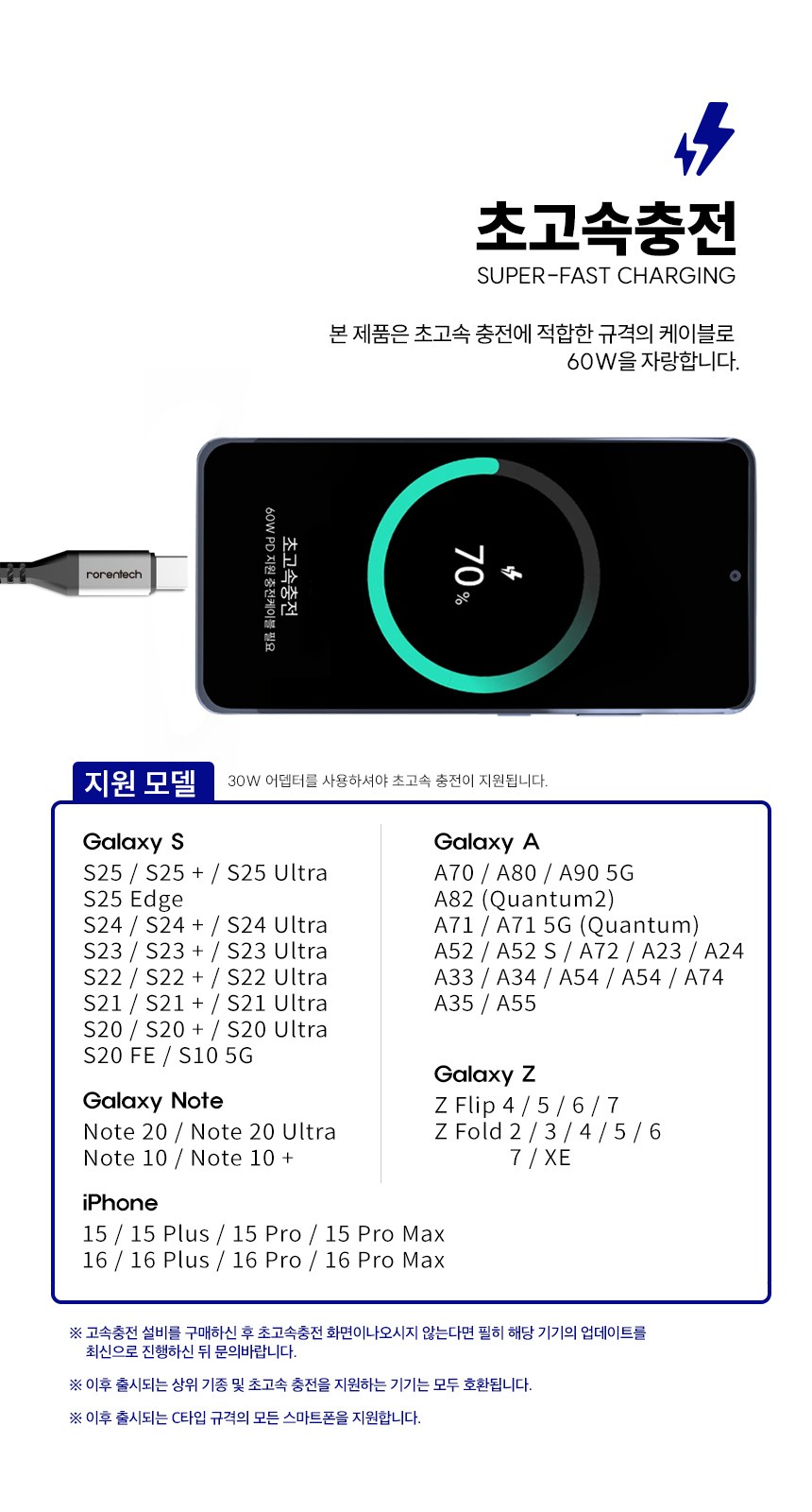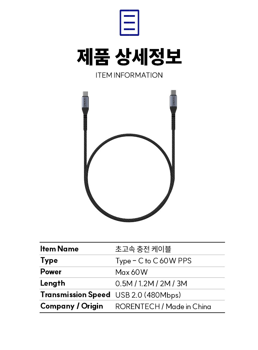| 품명 및 모델명 | 로랜텍 초고속 충전케이블 C to C PD 60W | 인증/허가 사항 | 해당없음 |