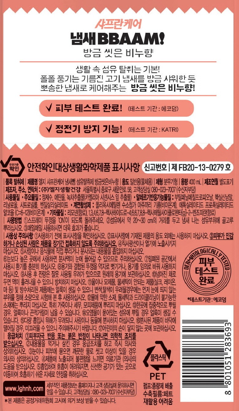 | 품목 및 제품명 | 탈취제 / 엘지 샤프란케어 냄새뺌 섬유탈취제 방금씻은비누향 | 용도(표백제의 경우 계열을 함께표시) 및 제형 | 일반용-물체용 / 분사형-분무기형 |