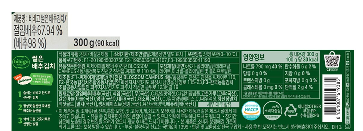 | 제품명 | CJ비비고 썰은 배추김치 | 식품의 유형 | 컨텐츠 참조 |