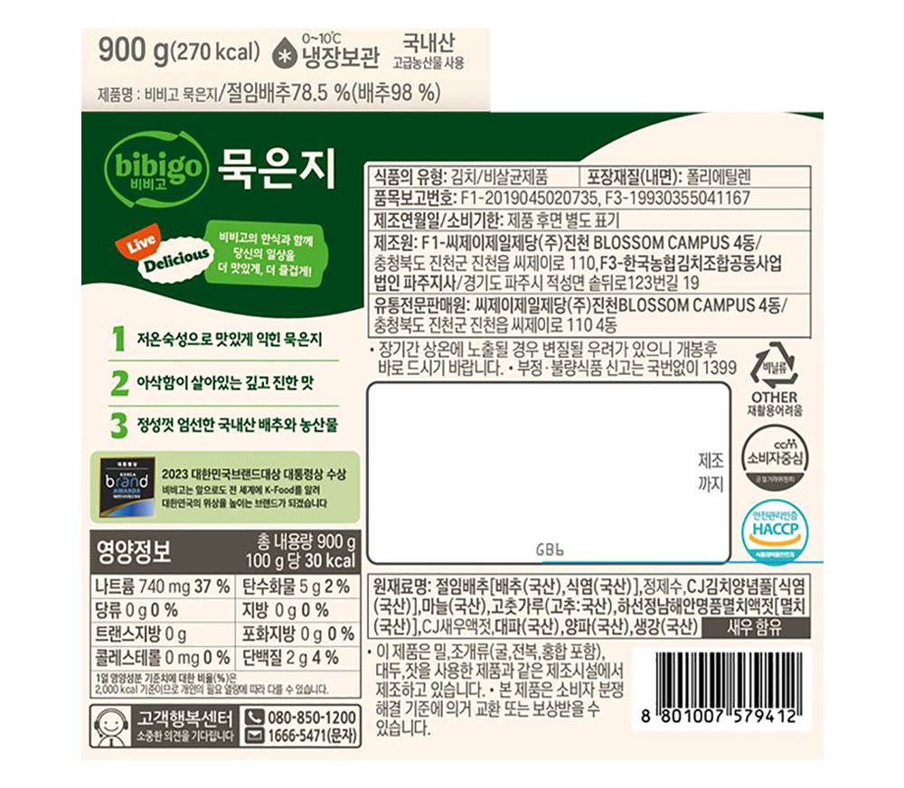 | 제품명 | 비비고 묵은지 | 식품의 유형 | 컨텐츠 참조 |