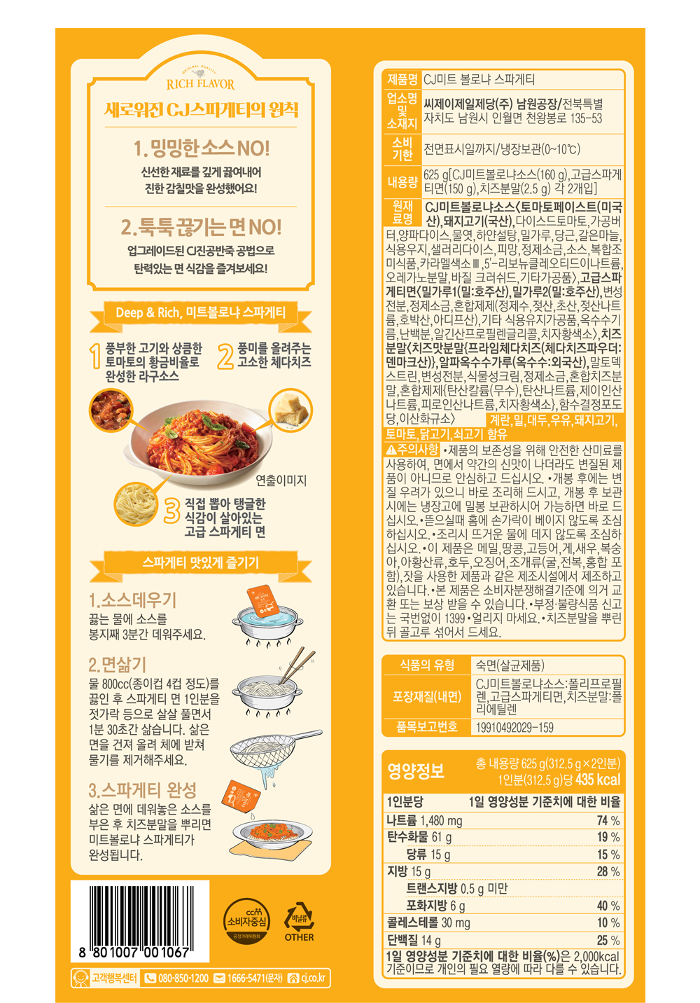 | 제품명 | CJ미트 볼로냐 스파게티 | 식품의 유형 | 컨텐츠 참조 |