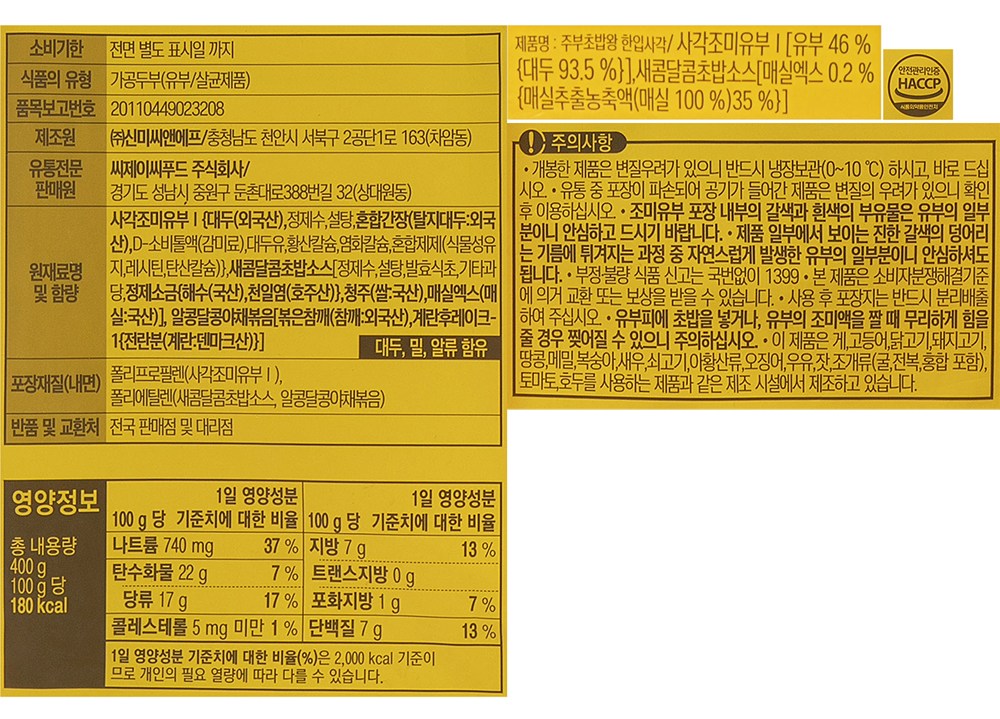 사각 조미유부, 새콤달콤 초밥소스, 알콩달콩 야채볶음으로 구성되어 있습니다.