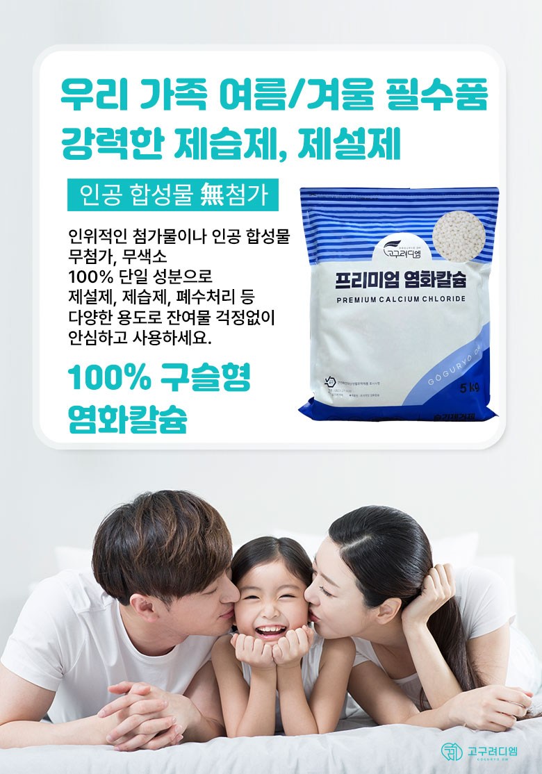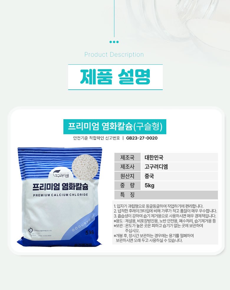 | 품목 및 제품명 | 습기제거제 / 프리미엄 염화칼슘 | 용도(표백제의 경우 계열을 함께표시) 및 제형 | 기타 > 습기제거제 > 실내공간용 / 비분사형 > 고체형 |