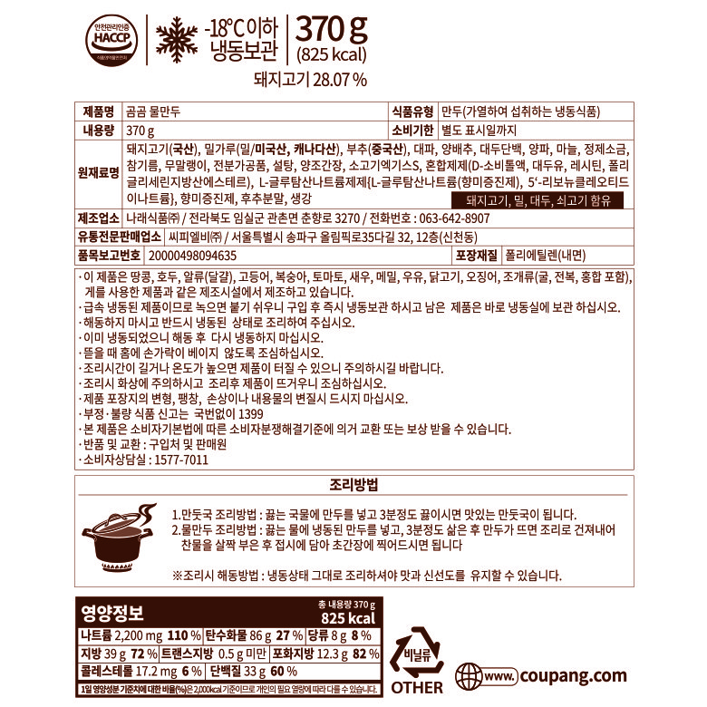 | 포장단위별 내용물의 용량(중량), 수량 | 370g, 12개 | 원재료명 및 함량 | 컨텐츠 참조 |