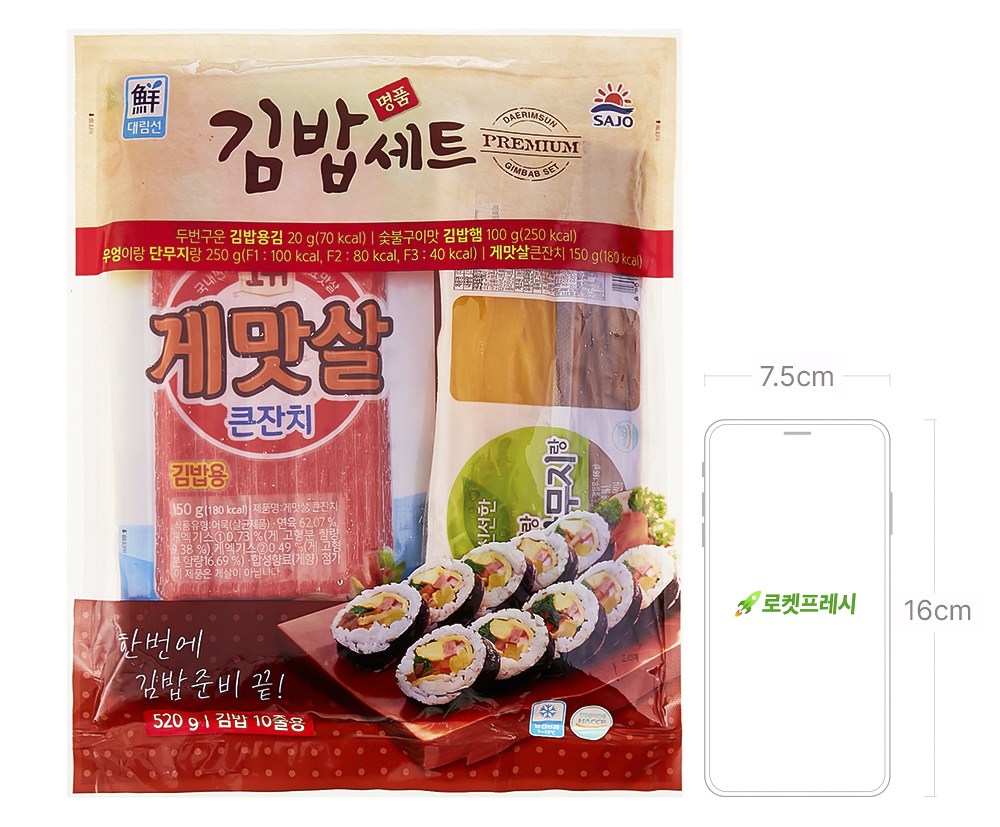 수고로움을 덜어줄 사조 명품 김밥 세트를 만나보세요. 두 번 구운 고소하고 맛있는 김, 아삭아삭한 우엉과 단무지, 은은한 단맛을 지닌 게맛살, 진한 풍미의 숯불구이맛 햄까지. 김밥을 만들기 위한 재료를 다양하게 구성했어요. 고슬고슬한 밥만 준비하면 간편하게 김밥을 만들 수 있답니다.