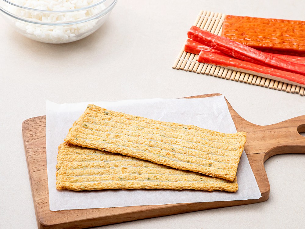 다양한 재료들의 조화로 든든하고 맛있는 별미가 되는 김밥. 오늘은 김밥 속에 담백한 어묵을 넣어 말아보세요. 고소한 연육과 당근, 부추 등의 채소를 섞어 만든 김밥용 어묵을 준비했답니다. 김밥 속에 한 줄씩 넣기 좋도록 손질되어 더욱 간편하게 활용할 수 있죠. 김밥 속에 부드럽고 탱글탱글한 식감과 함께 고소한 맛이 돋보이는 어묵을 넣어주면, 자꾸만 손이 가는 어묵 김밥이 탄생할 거예요.