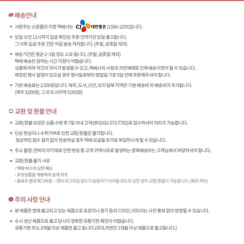 | 배송기간 | ㆍ도서산간 지역 등은 배송에 3-5일이 더 소요될 수 있습니다. - 천재지변, 물량 수급 변동 등 예외적인 사유 발생 시, 다소 지연될 수 있는 점 양해 부탁드립니다. | ||