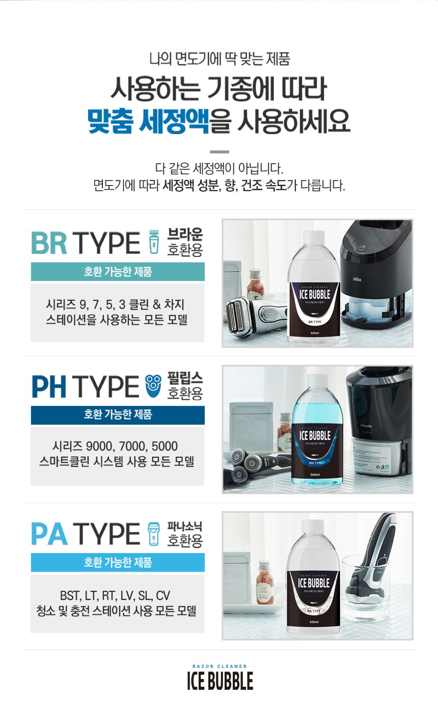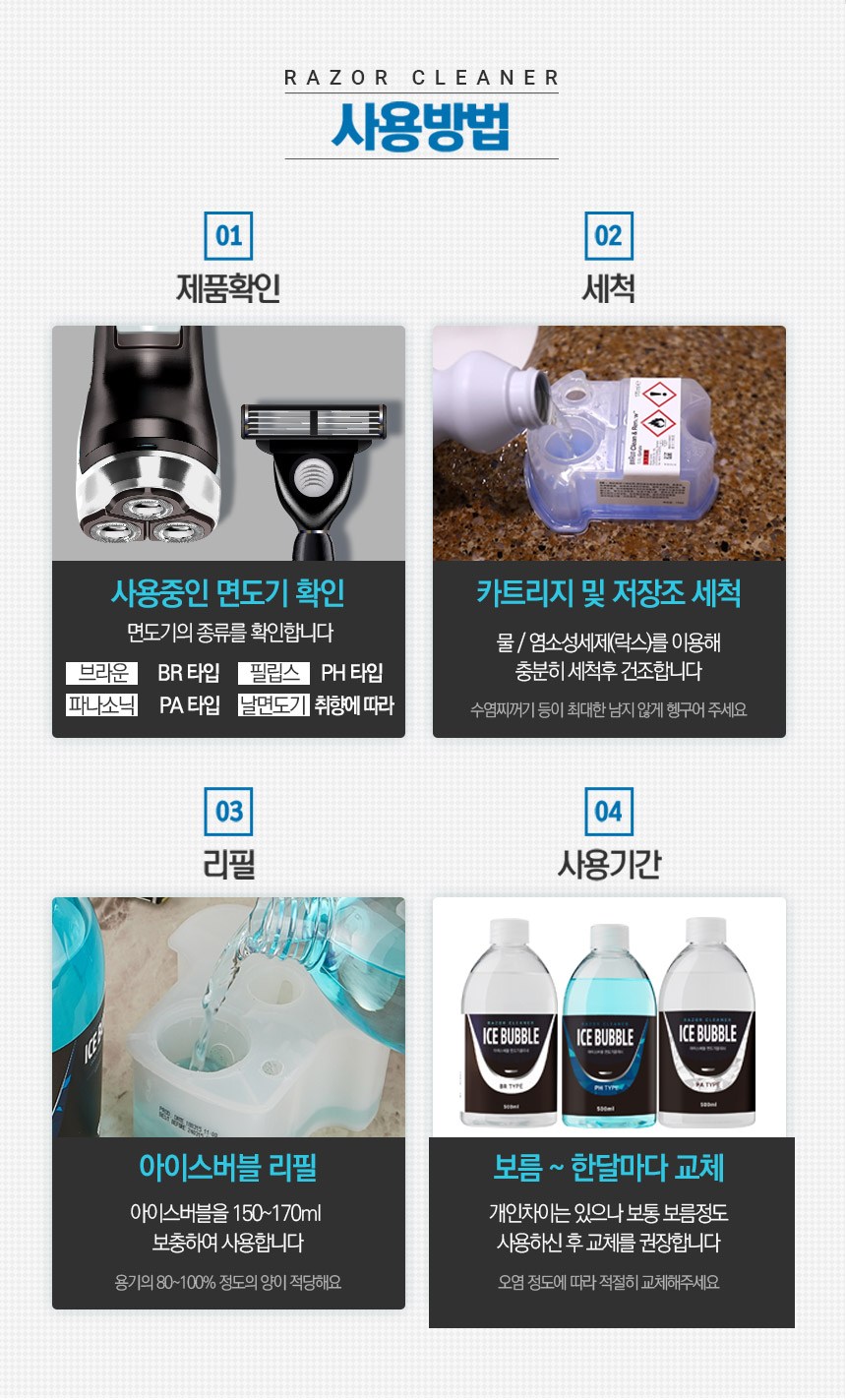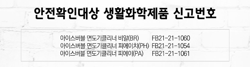 | 품목 및 제품명 | 살균제 / 아이스버블 면도기클리너 피에이치(PH) | 용도(표백제의 경우 계열을 함께표시) 및 제형 | 일반용-일반물체용 / 비분사형-액체형 |