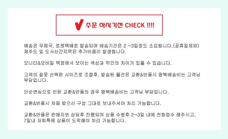 - ㆍ모니터 해상도의 차이로 인해 색상이나 이미지가 실제와 달라, 고객이 단순 변심으로 교환/반품을 무료로 요청하는 경우