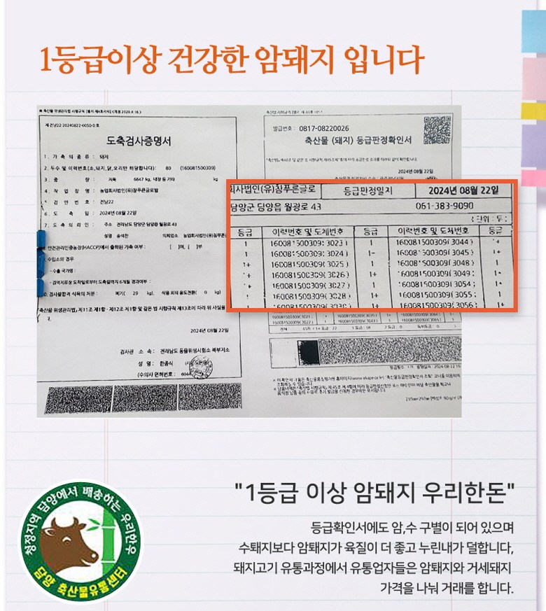 | 제조연월일, 소비기한 또는 품질유지기한 | 생산년도: 수시도축 1~3일전 도축정육배송제조연월일: 수시도축유통기한: 배송일로부터5일 | 세부 품목군별 표시사항 | <농산물>1) 유전자 변형농산물 표시 -2) 지리적표시 -<수산물> 1) 유전자 변형수산물 표시 -2) 지리적표시 -<축산물>1) 등급 표시 -2) 이력관리 표시 유무 -유 |