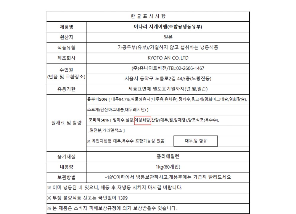 | 제품명 | 이나리 지케이엠(초밥용냉동유부) | 식품의 유형 | 컨텐츠 참조 |