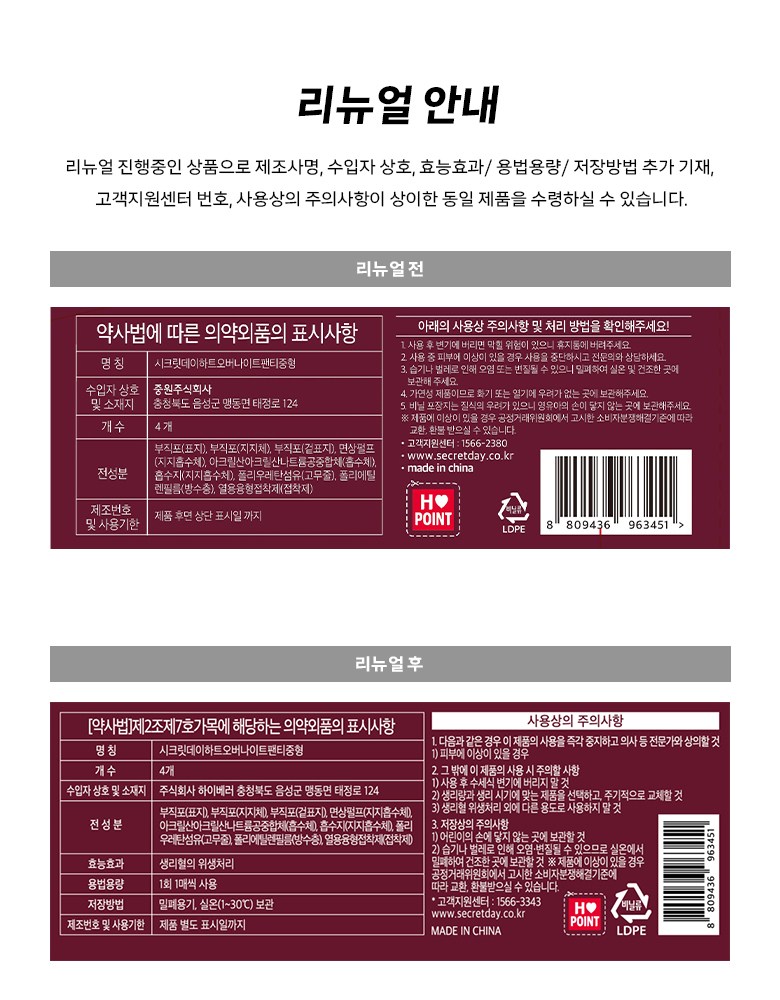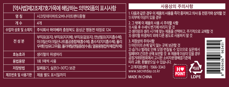 | 품명 및 모델명 | 시크릿데이하트오버나이트팬티중형 | 인증/허가 사항 | 의약외품 |
