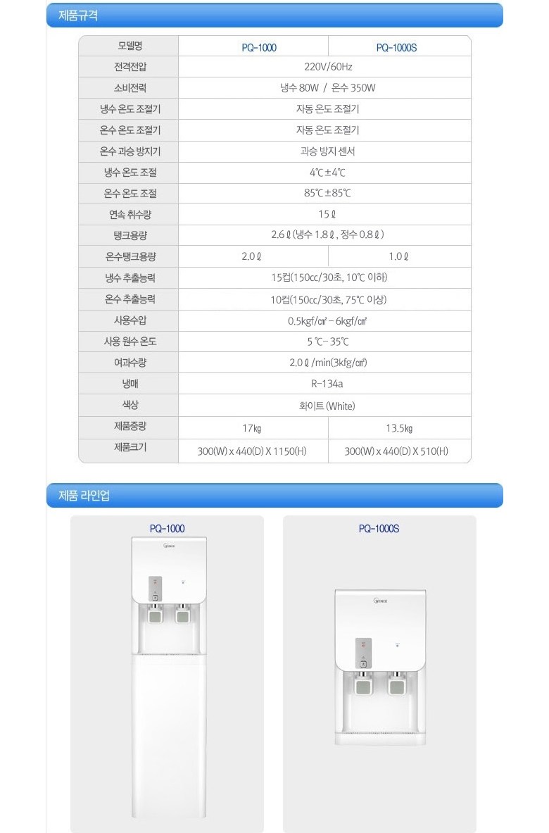 | 정격전압, 소비전력 | AC220V/60Hz | 에너지소비효율등급 | PQ-1000 : 3등급,PQ-1000S: 4등급 |