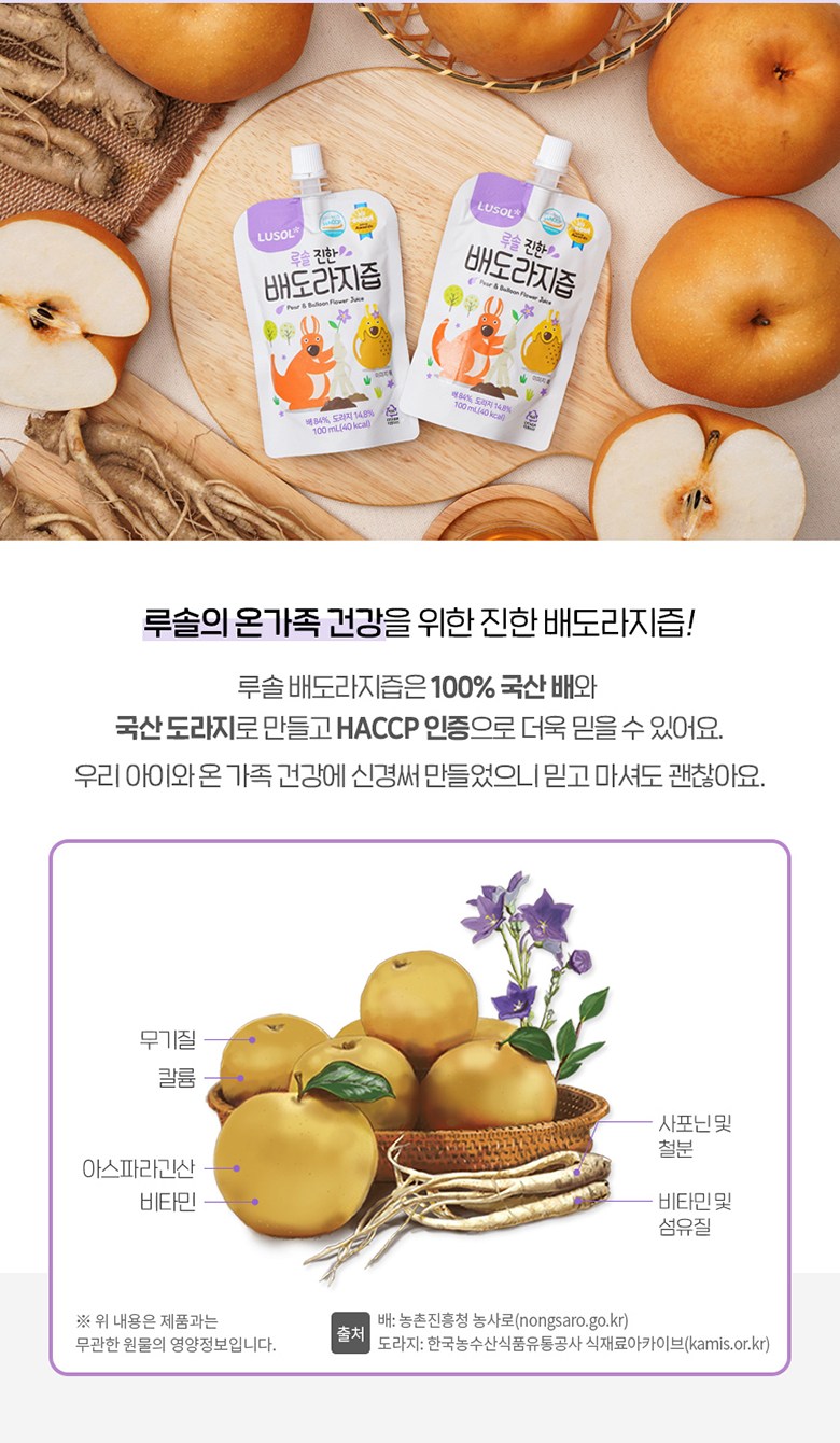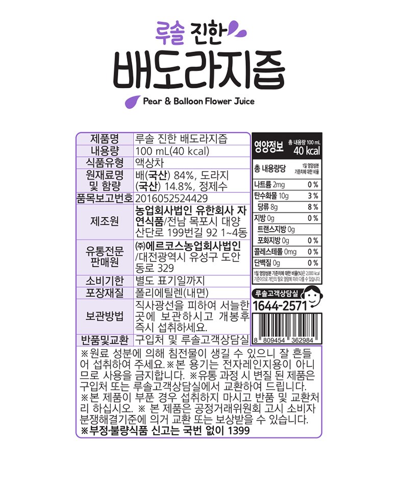 | 제품명 | 루솔 진한 배도라지즙 | 식품의 유형 | 컨텐츠 참조 |