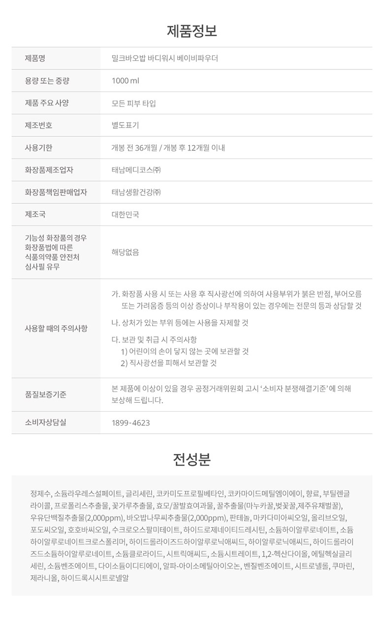 | 화장품제조업자, 화장품책임판매업자 및 맞춤형화장품판매업자 | 태남메디코스(주) / 태남생활건강(주) | 제조국 | 대한민국 |