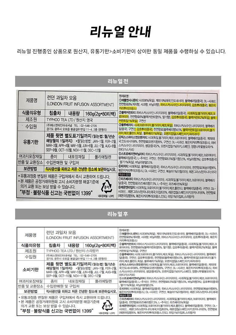 | 생산자 및 소재지 | 컨텐츠 참조 | 제조연월일, 소비기한 또는 품질유지기한 | 업데이트 예정 |