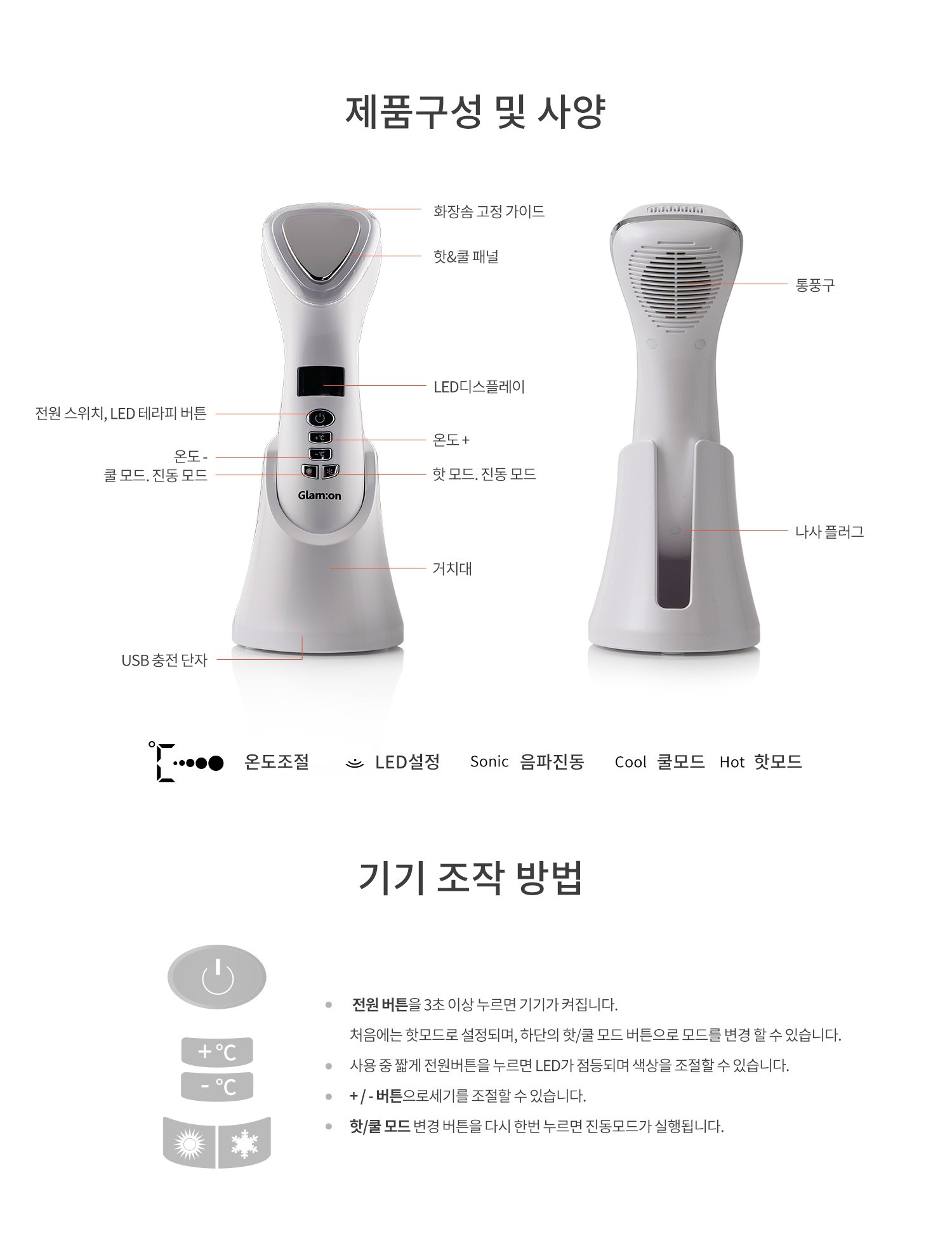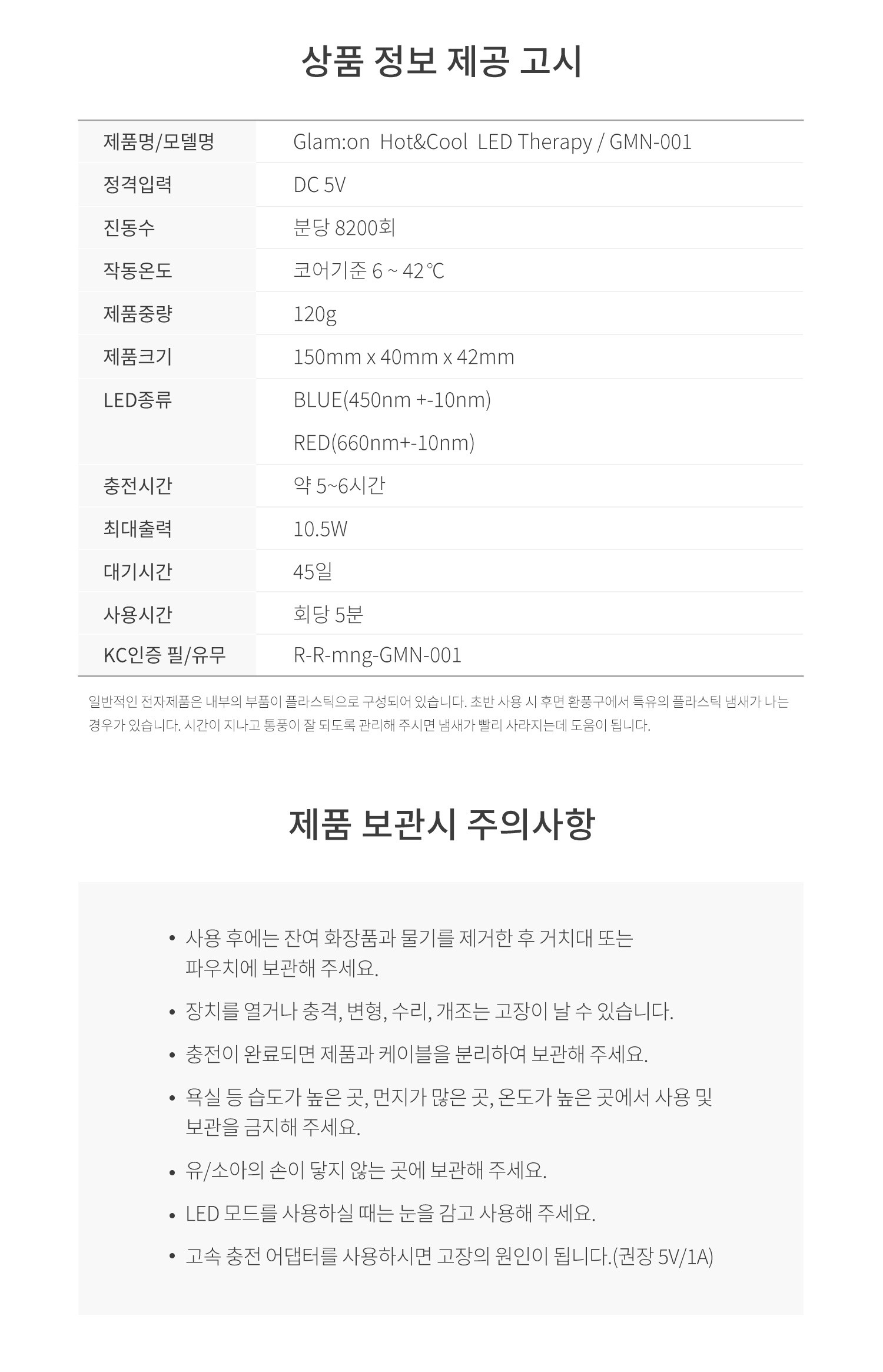| 품명 및 모델명 | 핫앤쿨 LED 피부마사지기 / GMN-001 | KC 인증정보 | 본품 : R-R-mng-GMN-001 / 배터리 : YU10736-17001 |