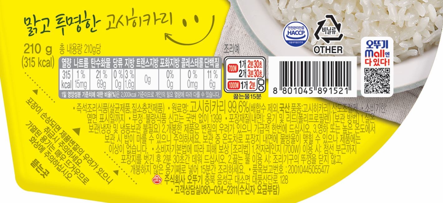 | 제품명 | 맛있는 오뚜기밥 고시히카리 210g | 식품의 유형 | 즉석조리식품(살균제품, 질소충전제품) |
