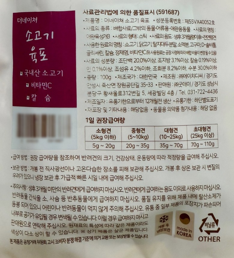 | 품명 및 모델명 | 더네이쳐 소고기육포 100g X 3개 | 인증사항 | 사료관리법에 따른 성분등록번호 : 컨텐츠 참조 |