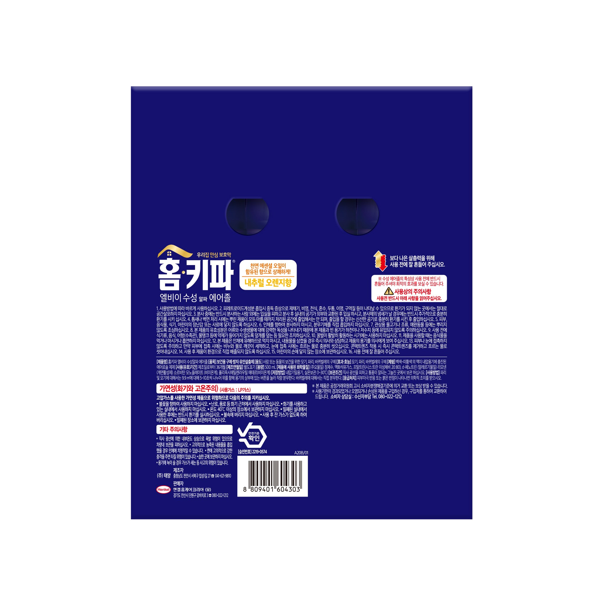 | 품목 및 제품명 | 보건용 구제, 방지, 유인살충제/홈키파엘비이수성알파에어졸 | 용도(표백제의 경우 계열을 함께표시) 및 제형 | 사람 또는 동물의 보건을 위한 모기, 파리, 바퀴벌레의 구제 / 백색-미황색의 액이 내압용기에 충진된 에어로솔 제제 |