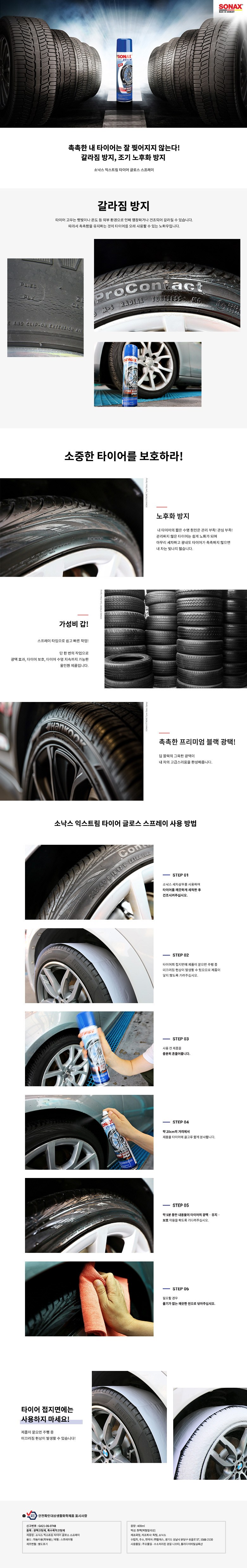 | 품목 및 제품명 | 광택코팅제, 특수목적코팅제/소낙스 익스트림 타이어 글로스 스프레이 | 용도(표백제의 경우 계열을 함께표시) 및 제형 | 광택코팅제-자동차용(외부용) 특수목적코팅제-자동차용(외부용)/스프레이형 |