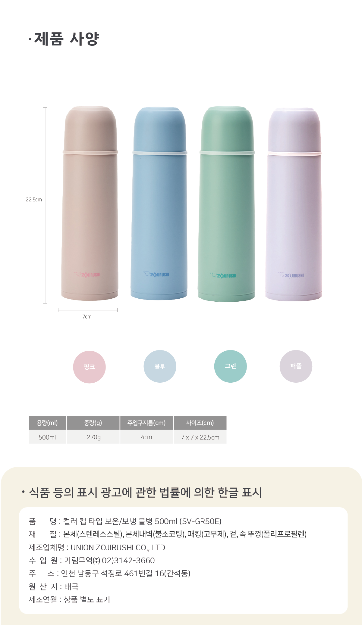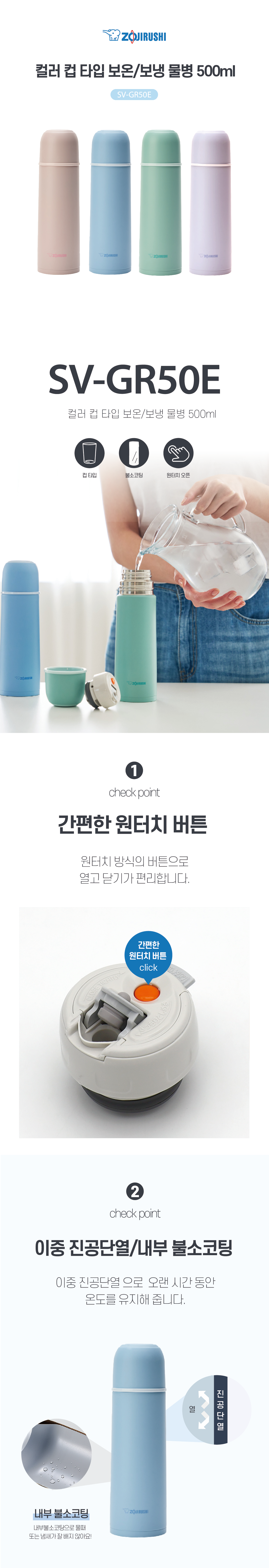 | 품명 및 모델명 | 조지루시 컬러 컵 타입 보온 보냉 물병 SV-GR50E VA | 재질 | 컨텐츠 참조 |