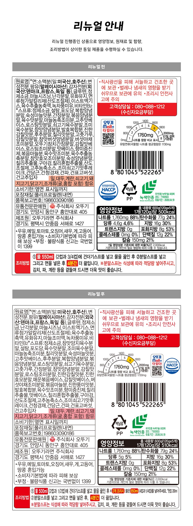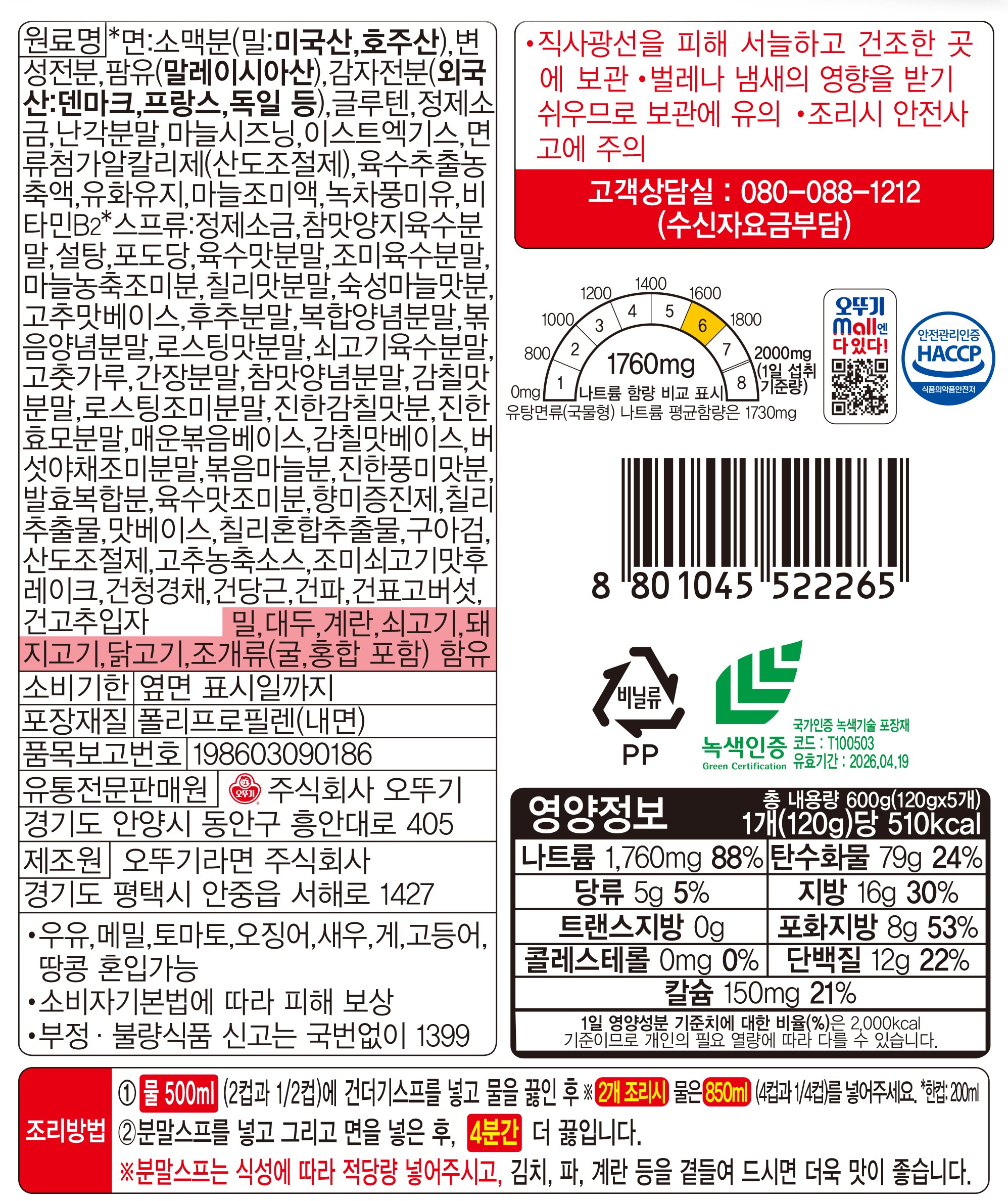 | 제품명 | 오뚜기 진라면(매운맛) | 식품의 유형 | 유탕면 |