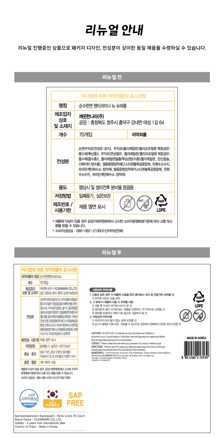 | 품명 및 모델명 | 순수한면팬티라이너뉴 | 인증/허가 사항 | 의약외품 |