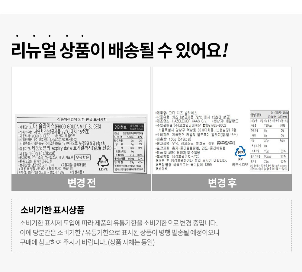 | 생산자 및 소재지 | YOKO CHEESE / ㈜코호인터내셔날 / 네덜란드 | 제조연월일, 소비기한 또는 품질유지기한 | 업데이트 예정 |