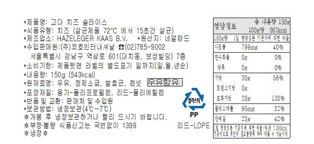 | 제품명 | 고다 슬라이스 | 식품의 유형 | 자연치즈 |