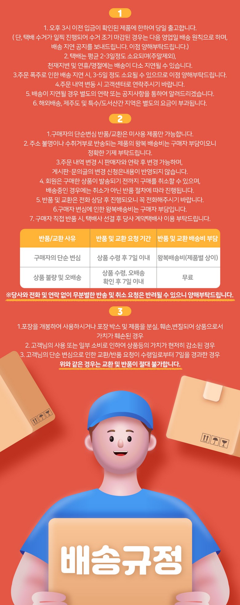 - ㆍ교환/반품에 관한 일반적인 사항은 판매자가 제시사항보다 관계법령이 우선합니다.